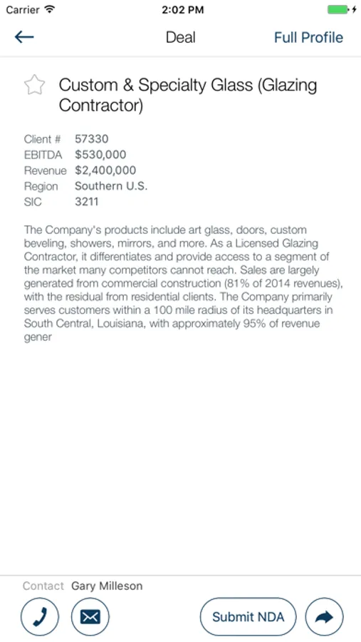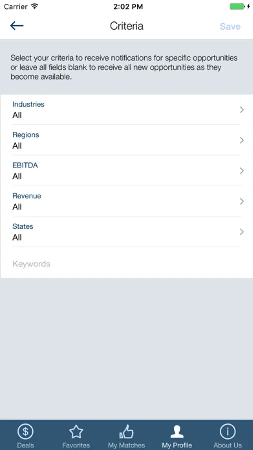 - Filter based on criteria (SIC, keywords, EBITDA, revenue, etc.)