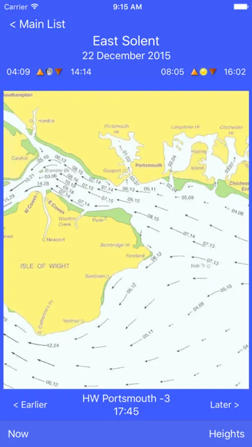 Selecting an entry will display an easy to use daily chart view showing the tide height for any time of day and a tidal stream view showing tidal direction and speed at hourly intervals.