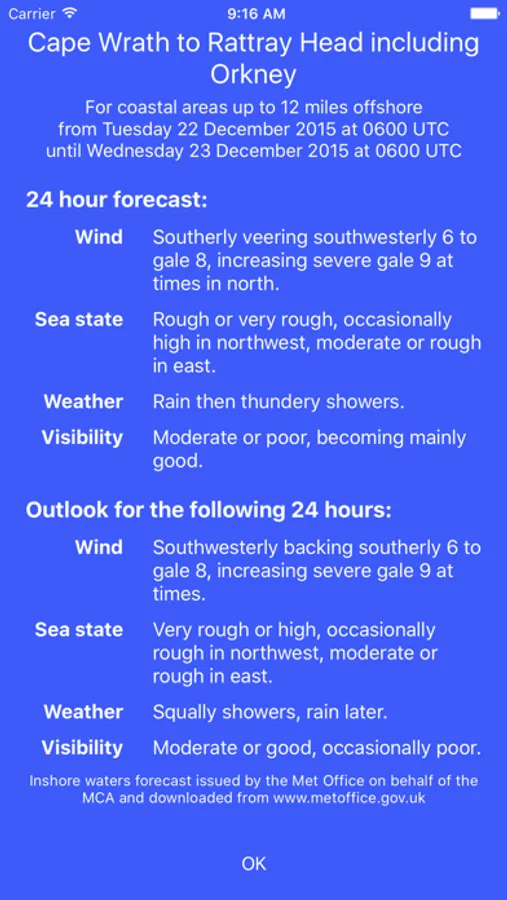The Weather section downloads and displays the current Met Office Inshore Forecast.