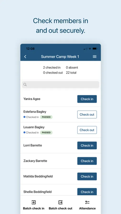 Check Members In and Out: Eliminate paper sign in/out forms, improve the drop-off and pick-up process for families, and automatically archive records for licensing requirements.