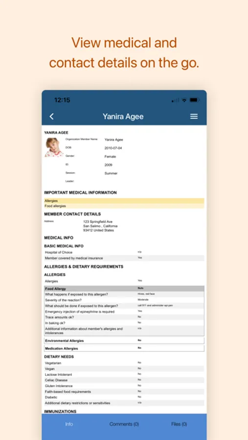 Critical Information at Your Fingertips: View medical information (including allergies and dietary needs), flagged conditions, medications and treatments, and waivers and consents.