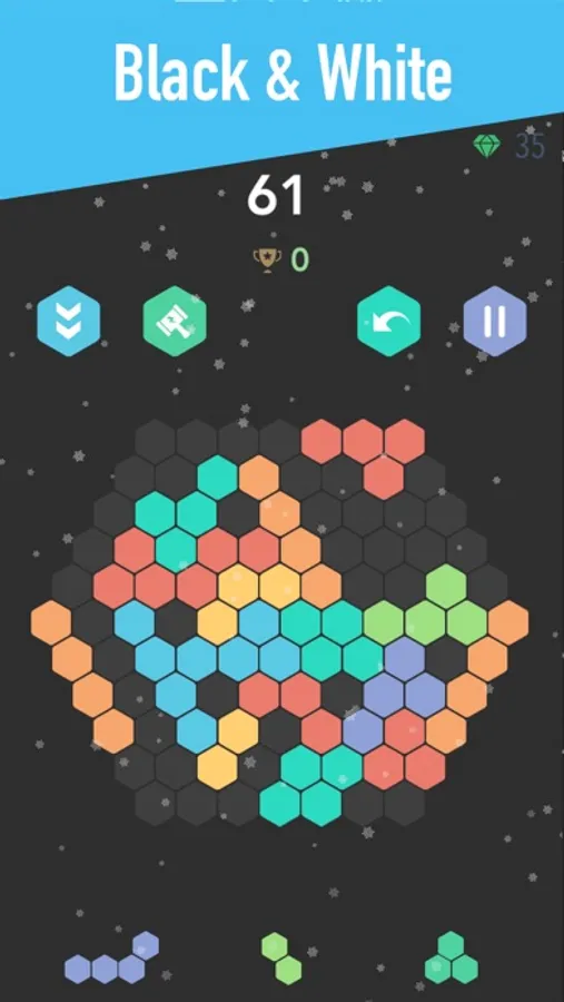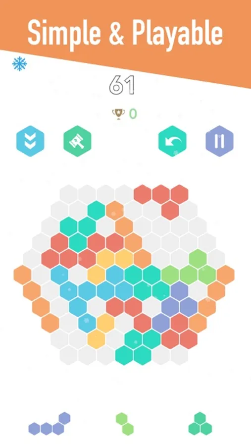Simply drag and drop the hexagonal combination at the bottom into the hexagon matrix and connect them in a straight line in three directions to eliminate the squares in the straight line. The game ends when the candidate squares cannot be dragged to the center of the screen. No time limit, no color matching! Use matching hexagon combinations to match arbitrarily, and enjoy the series that can’t be stopped!