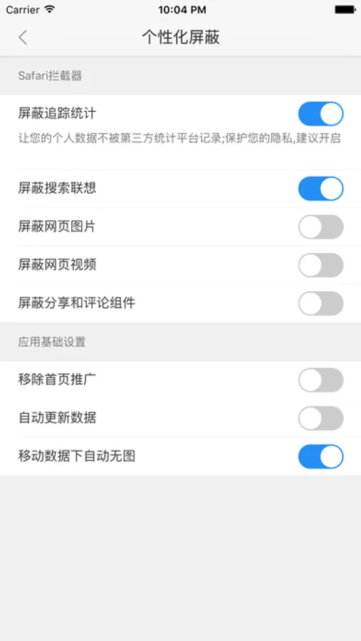 安装后,请在设置→Safari→内容拦截器,找到广告猎手,并全部开启。