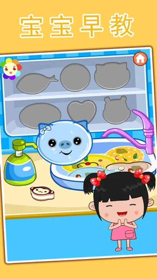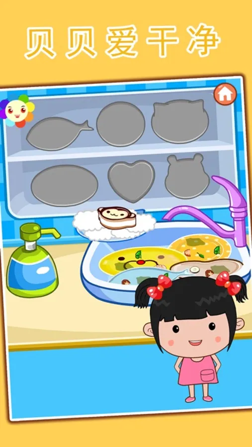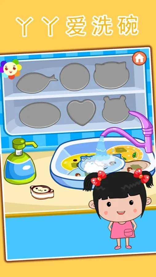 丫丫小朋友会洗洗碗喽,可爱的丫丫在游戏的语音和图形的指导下自己会洗碗咯,小朋友在游戏中体会做家务和过家家的乐趣,在自己动手的过程中创作快乐!
