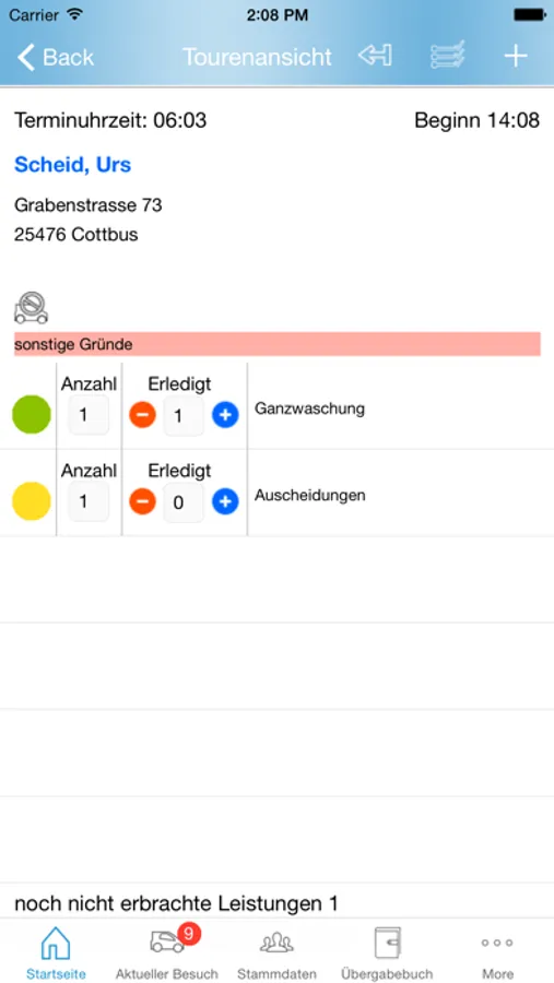 - Beim Scan eines Besuchsendes wird überprüft, ob mindestens eine Leistung nicht als erledigt markiert wurde. In einem solchen Falle wird ein entsprechender Hinweis mit Abfrage [Nein / Ja] ausgegeben.