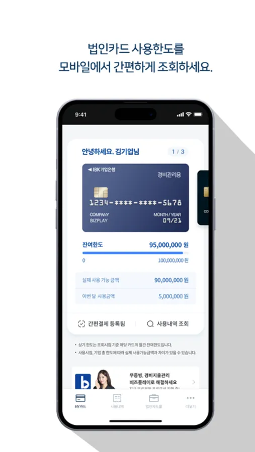 메인설명 : 법인카드 한도조회 너무 불편하셨죠? ARS로 3분 걸리는 한도조회를 원터치로 3초만에 할 수 있습니다.