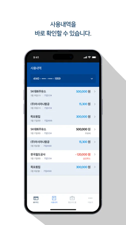 - 사용내역 조회 : 등록한 카드의 최근 3개월 사용내역과 이용한 가맹점의 상세정보를 확인할 수 있습니다.