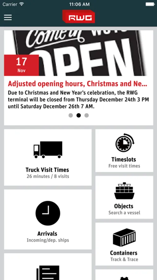 RWGServices is an application of container terminal Rotterdam World Gateway (RWG). RWGServices gives customers and transport companies insight into the departure and arrival times of vessels, container statuses and the turnaround times of truck visits. The user also receives notifications in case of important messages and news.