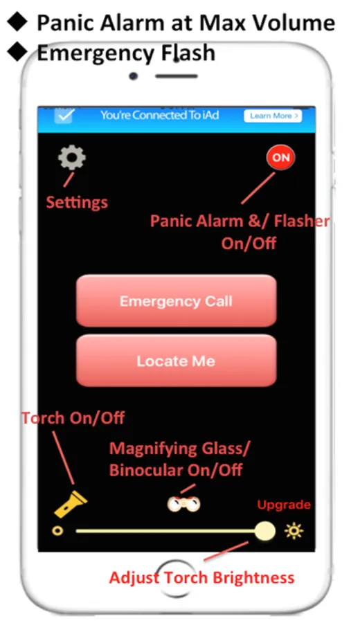 SafetyLight app can instantly turn your iPhone/iPad/iPod into portable personal safety product. It comes with panic alarm at Max volume,Emergency flasher, emergency call, LED flashlight, Magnifying glass/Binocular, locate me and SMS current location to emergency Phone No. features. You will be prompted to set emergency call number for first time use.