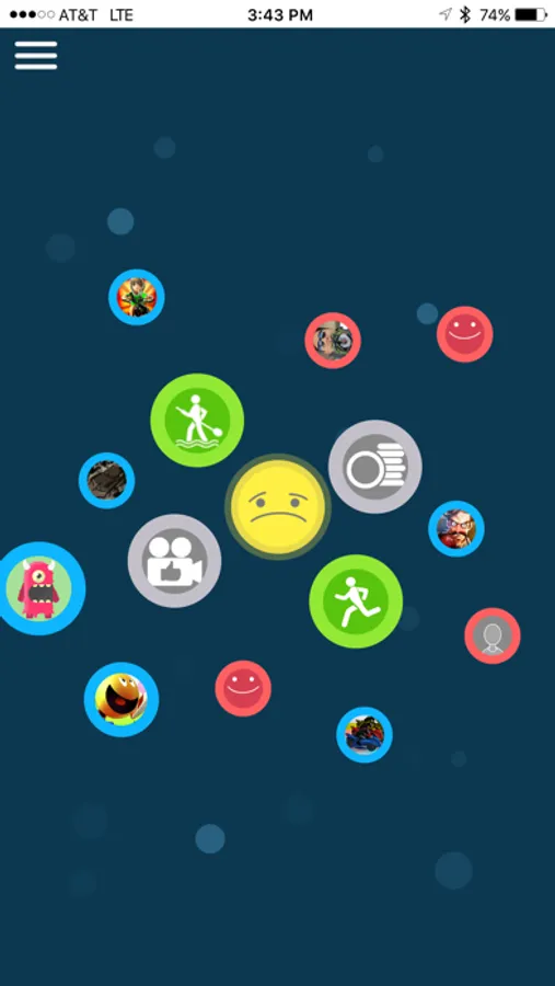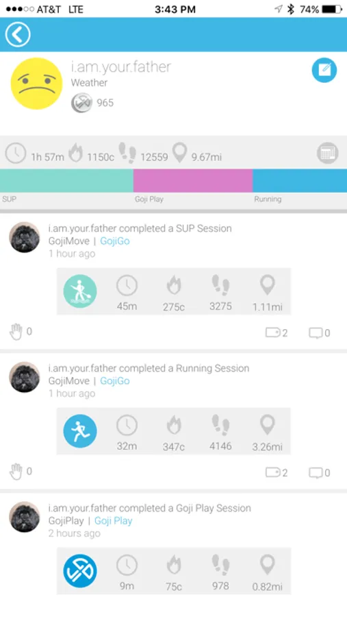 GojiVerse sports an innovative UI that puts the user at the center of her wellness universe – her MeStar – surrounded by her favorite Goji Play Game Stars (in blue), Goji*Go Activity Stars (in green), Friends and Family Stars (in red), and Goji Incentive and Moments Stars (in grey) circling slowly. Tapping on a Star, a user can quickly view her recent activities of the tapped Star. And both the sizes and locations of these Stars are context-sensitive: they reflect the durations and points in time of her recent activities. For example, after a user finishes playing a set of Goji Play games on a elliptical machine, these corresponding Game Stars will automatically capture the minutes of her exercise and move closer to her MeStar accordingly. If the user stops continuing any prior activities or communicating with friends and family, these Stars will slowly drifts away from the MeStar (until they fall into the invisible layer; these Stars can still be accessed through the menu option). With a quick glance of her GojiVerse, a user can plan her workout smartly.