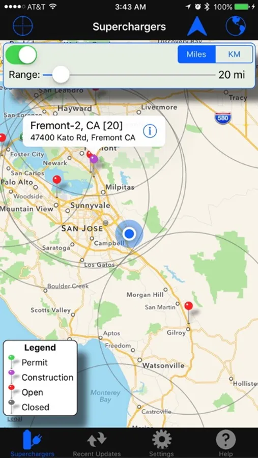 • Variable Range Circles: Range circles tell how far from each Supercharger you are.