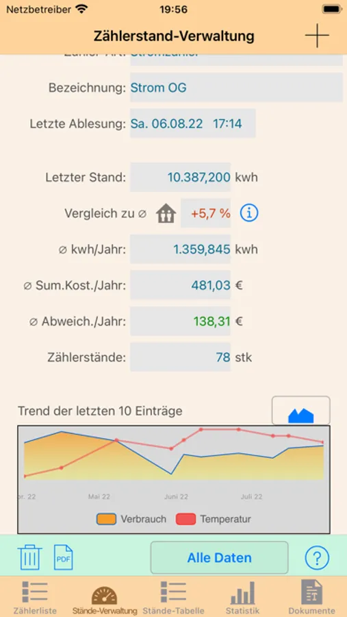 - Trendgrafik der letzten 10 Verbrauchswerte in Zählerstandverwaltung.