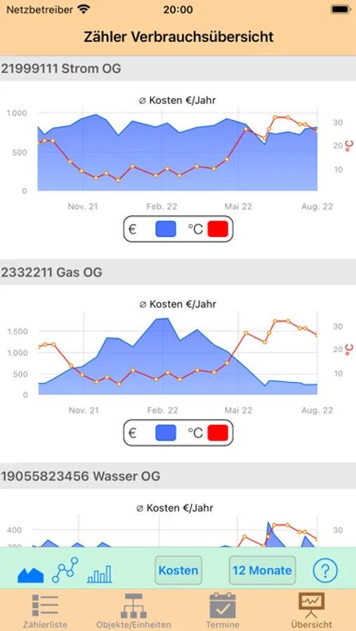 - Grafische Zähler-Übersicht aller Zähler mit Verbrauch: 6 Monate, 12 Monate, Alle Daten.