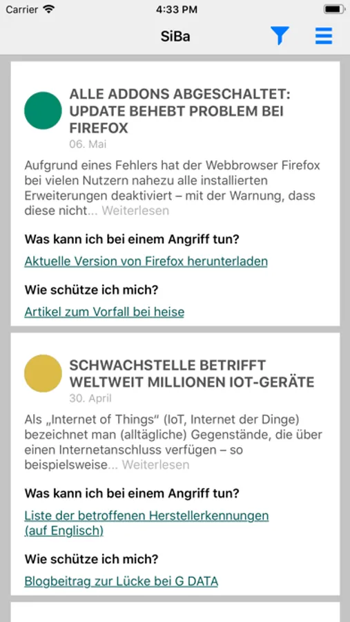 Das Sicherheitsbarometer stellt Ihnen Meldungen zu aktuellen Risiken für den digitalen Alltag bereit mit passenden Sicherheitstipps. Kurz und bündig werden Sofortmaßnahmen aufgezeigt sowie konkrete Schutzmöglichkeiten. Die Risiken sind durch eine Ampelkennzeichnung leicht zu erkennen und vermitteln damit ein Höchstmaß an Orientierung. Über außerordentliche Gefahren informiert die App durch Push-Nachrichten direkt auf Ihr Smartphone.