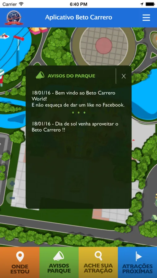 Com ele é possível se localizar através da funcionalidade ´´Onde estou``, receber avisos e dicas do parque, procurar uma atração e descobrir as atrações mais próximas de onde você se encontra no parque.