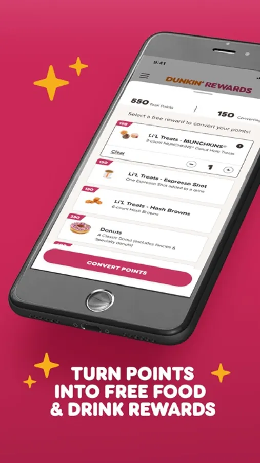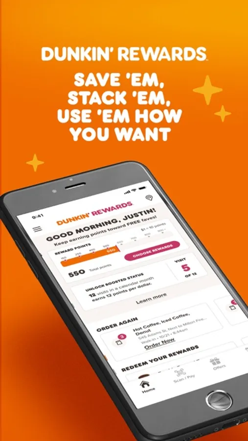 Runnin' has its rewards. Join our new rewards program, DUNKIN’ REWARDS, to earn your choice of free food and drinks, unlock Boosted Status to earn points faster and score members-only exclusive offers. Members earn 10 points per $1 spent on qualifying purchases in-store or when they order ahead.