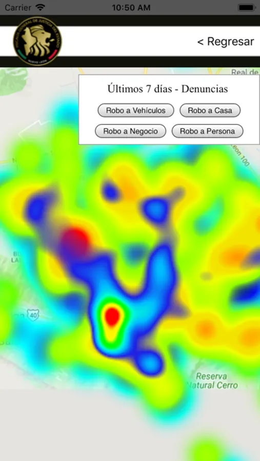 Seleccione la opción Mapa del Delito, se mostrara un mapa de calor basado en la denuncias realizadas en el estado de los últimos 7 dias.