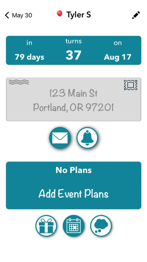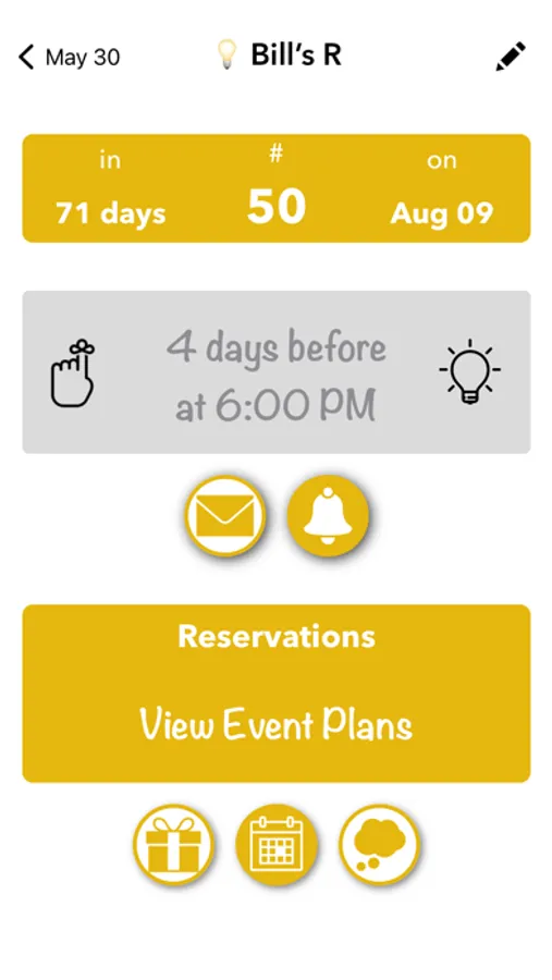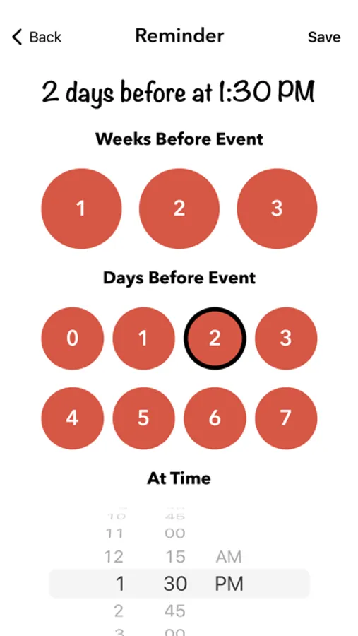 Set alerts to be reminded when events occur preceding any given birthday, anniversary or custom event via push notifications down to 15 minute intervals up to a week before an event occurs.