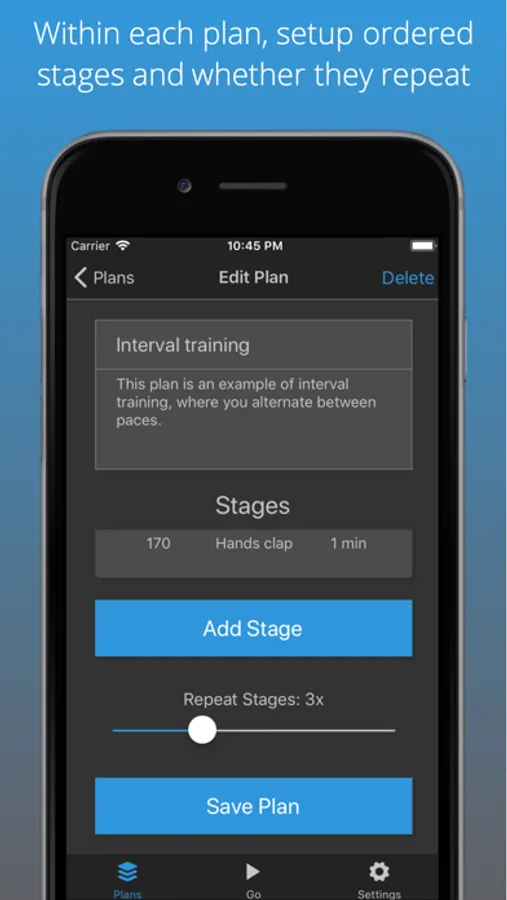 A plan can also repeat its stages, enabling some basic interval training / HIIT / tabata functionality.