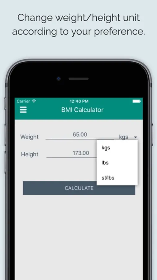 In this app, you can change the unit of weight by clicking on in and select from 3 options: kgs, pound, stone/pound. You can also choose your hight in 3 units: cms, meter and feet/inch. You can also change gender or activity type by simply clicking on it.