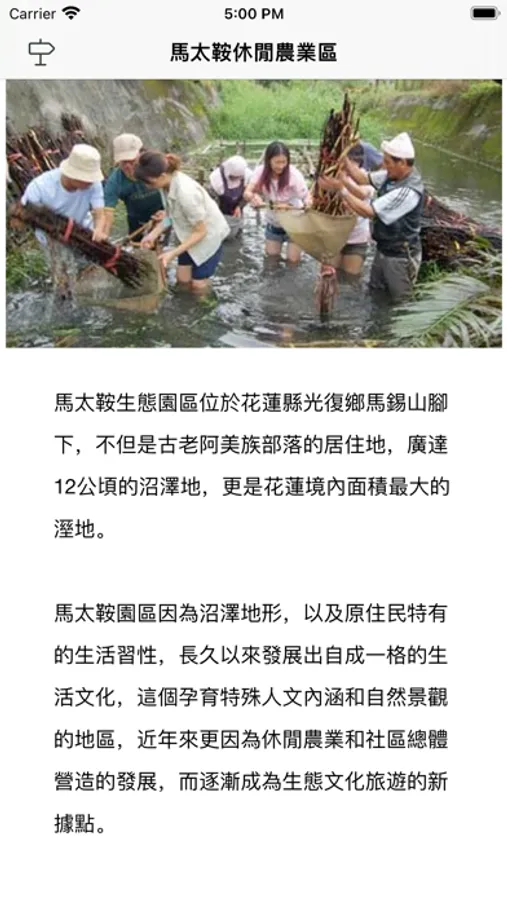 「區內以山區溪谷地形為主,為中低海拔動植物的棲息之所,可觀察原始森林、野生動植物、魚類和保育類鳥類,像是大冠鷲、黃嘴鳥梟、領角梟、藍鵲及鉛色水鶇。區內景觀較無受人為破壞,因此保有豐富的自然、人文與農業生產景觀,加上昔日遺留的文化資產及農村物產,是一處兼具自然生態、故事性與歷史性的休閒農業區。」