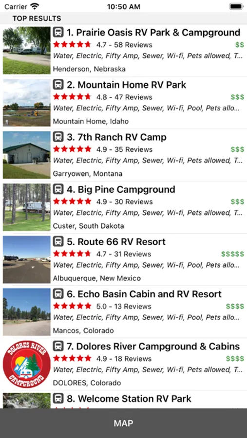 The #1 camping app of 2020. This app was developed to help people find great RV Parks in North America (USA, Canada, Mexico). Find over 40,000 RV parks, campgrounds, rest areas, gas station, and stores. Commercial RV parks are sorted by rating and can be viewed in list mode. If you zoom in far enough, you will see gas station, rest areas, stores, etc. Compared to similar applications, this app uses local database, so it works much faster and less dependent on internet, however internet is required to view maps and pictures.