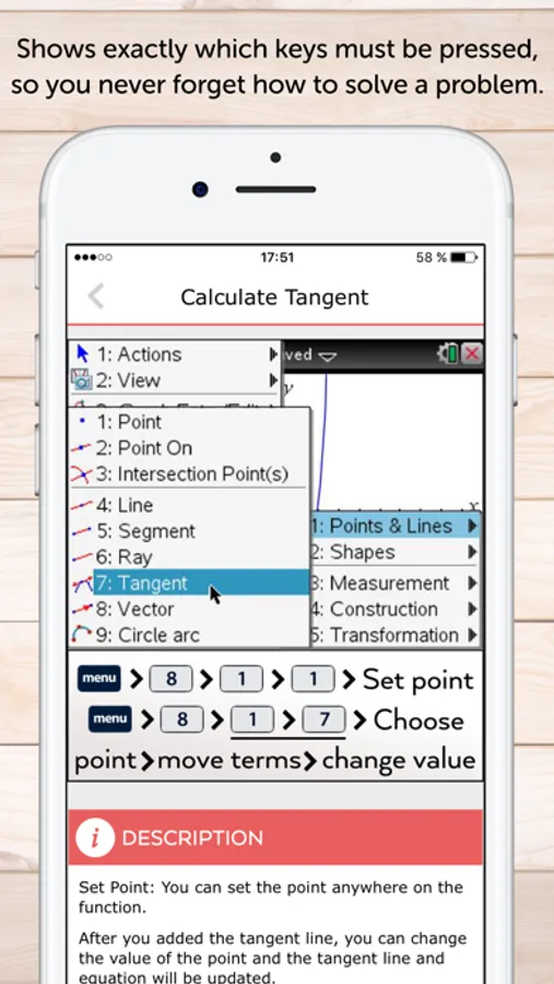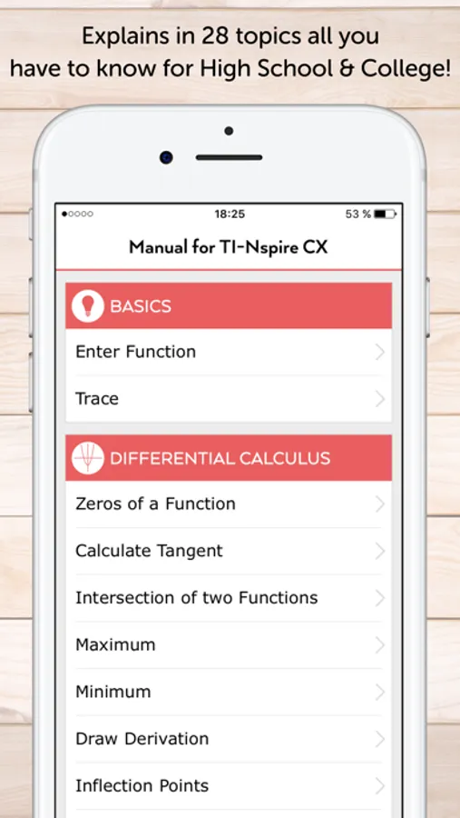 • Every topic shows a detailed instruction through screenshots of the original graphing calculator TI-Nspire CX which show how to solve the math problem. You only have to swipe to get the next screenshot which looks similar with your calculator display!