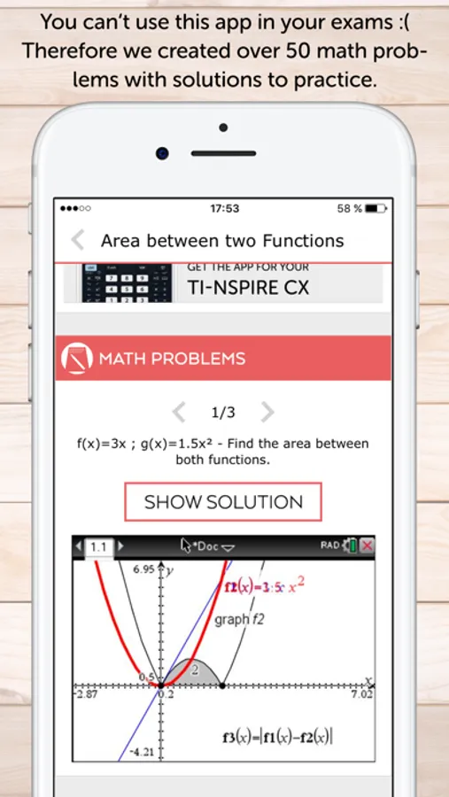 • To ”become warm” you have the possibility to insert a sample function in your calculator which is used in the app. The app shows an example for every topic. After that, press the first key of the respective key press sequence on the graphing calculator. Then swipe once again to get the next screenshot. It will look like the display of your calculator. The app contains for each step a picture, so it's easier to solve your math problems and become a TI-Nspire CX professional.
