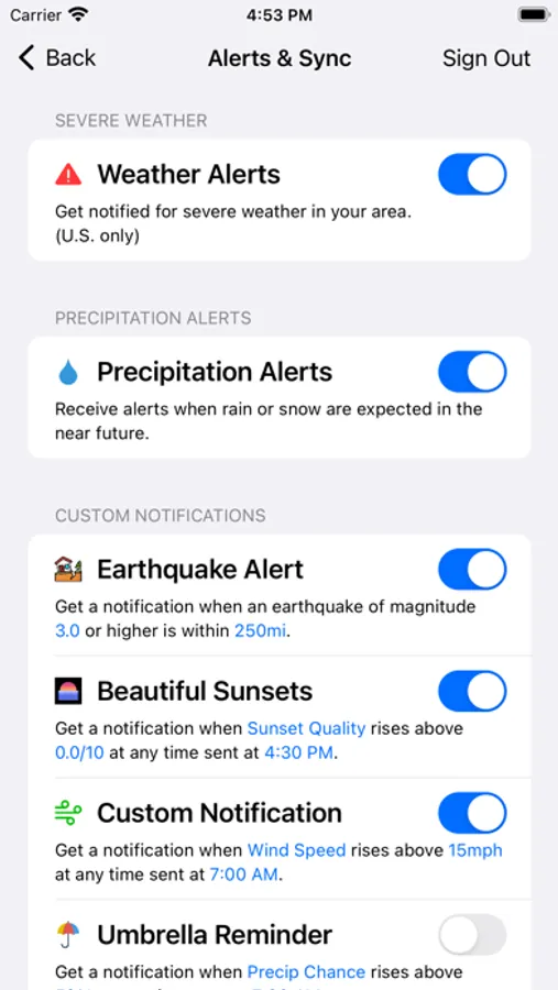 - Custom notifications and alerts! You can configure 14 different data points to look out for what matters to you. For example, get notified in the morning when wind during the day will rise above a certain speed, or if temperatures overnight will drop below freezing. (Gold only)