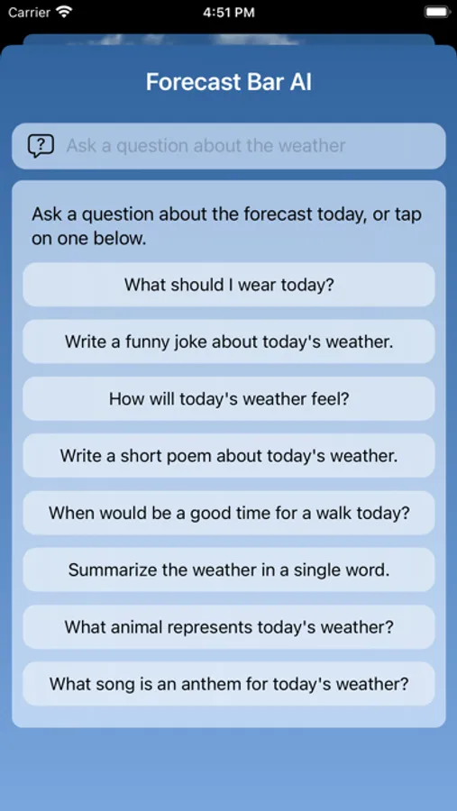 Forecast Bar AI allows you to ask questions about the day's weather using the same technology powering ChatGPT!