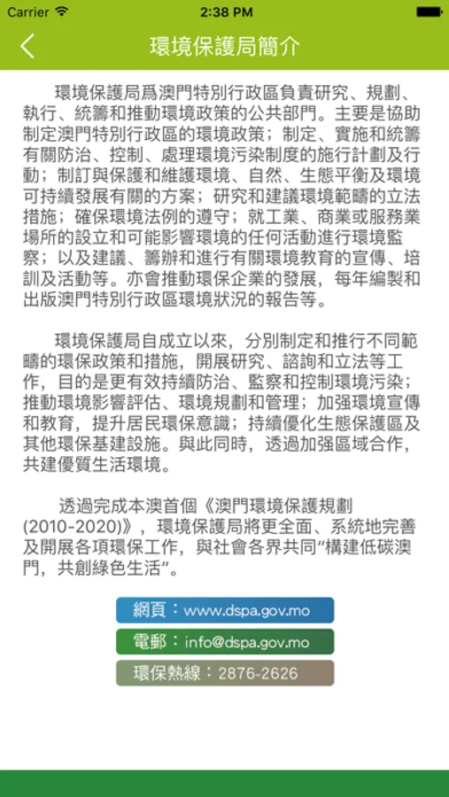 Para a população poder receber de forma conveniente as informações mais recentes, elevar a consciência ambiental e promover melhor uma vida verde, a Direcção dos Serviços de Protecção Ambiental (DSPA) lançou uma aplicação de telemóvel como instrumento auxiliar, para impulsionar a plataforma de serviços electrónicos de forma mais global e diversificada.