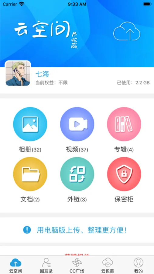 使用CC空间,您可以将个人、家庭和圈子的各种信息(照片、视频、文件、资料等)上传到云上,然后对这些信息进行集中、统一的整理,如归类、标注、排序等。云空间里的所有内容都是私密、安全的,其他人无法查看和获取。