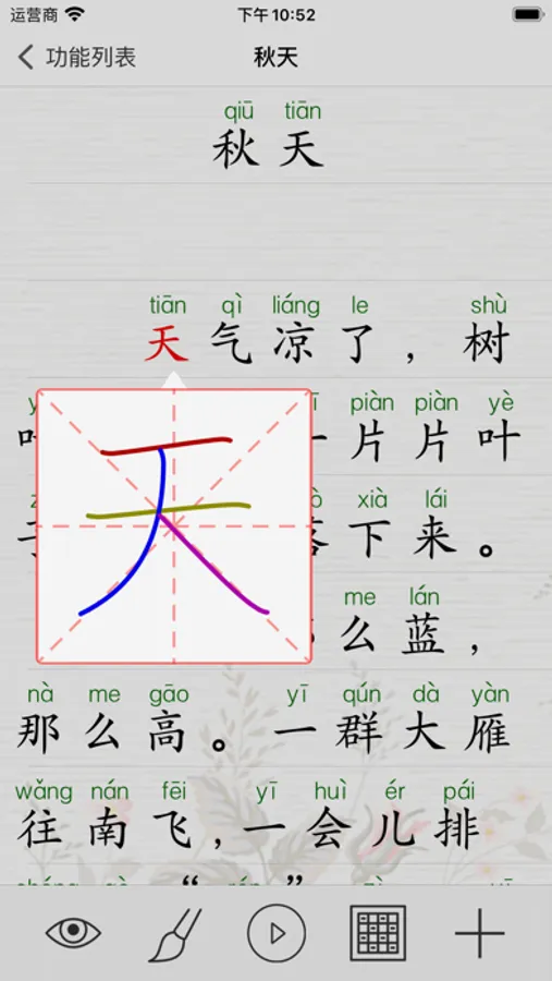 “九、为、方、入、门、绿“等简单常用的汉字,写起来却容易笔顺错误。从开始就养成正确的书写习惯非常重要,本应用严格遵守国家语言文字工作委员会和国家新闻出版署发布的《现代汉语通用字表》的字形结构和笔顺,让学生快速正确掌握汉语的听说读写。