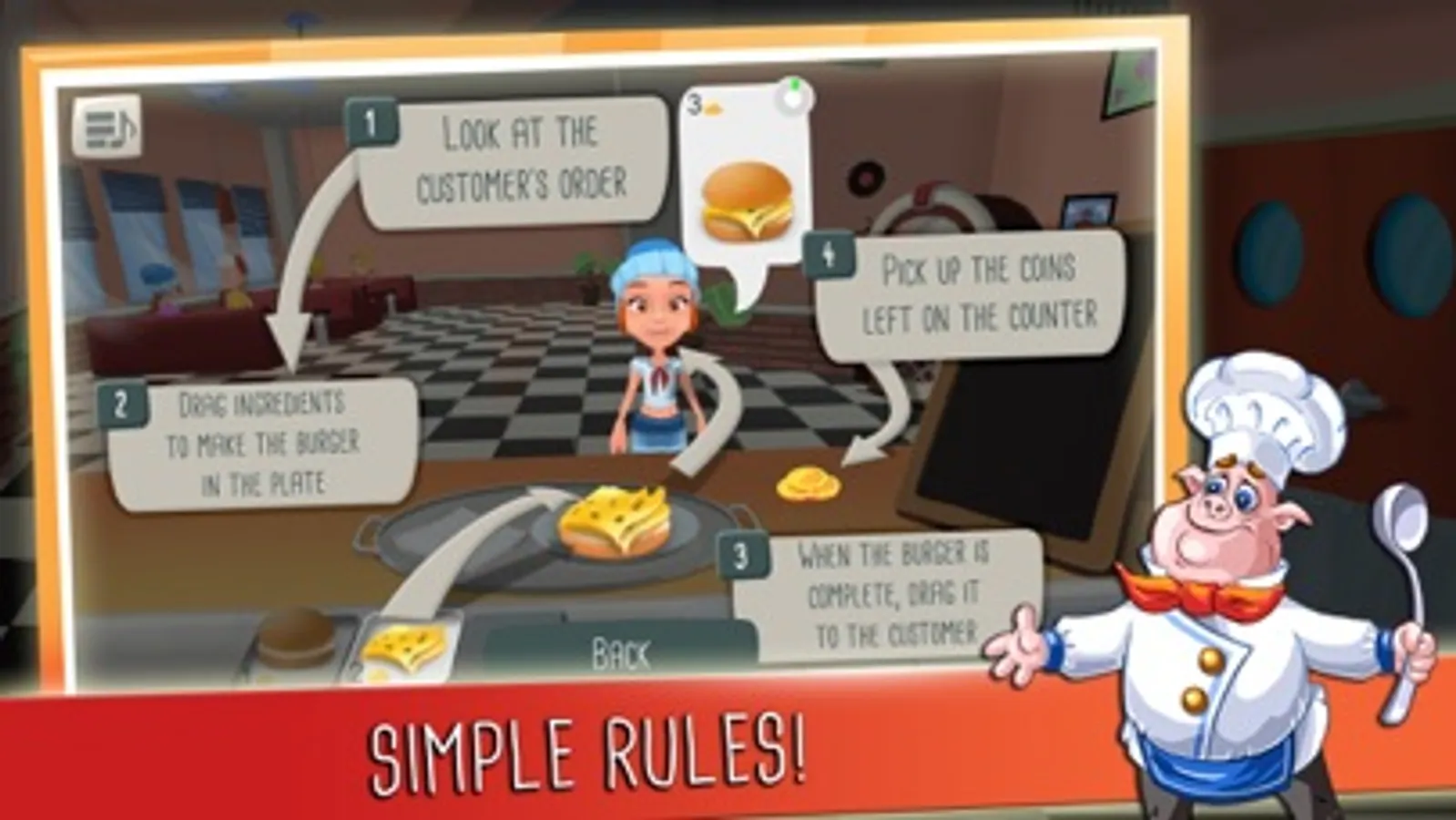 You only start with White bun, Cheese, Meat and Pickles. Unlock the rest of the ingredients to make your burgers even more delicious. Nail the pickiest orders, by offering tons of extras such as: Ketchup, Onion, Mayonnaise, Dark bun, Mustard, Tomato, Sesame bun, Lettuce and Bacon.