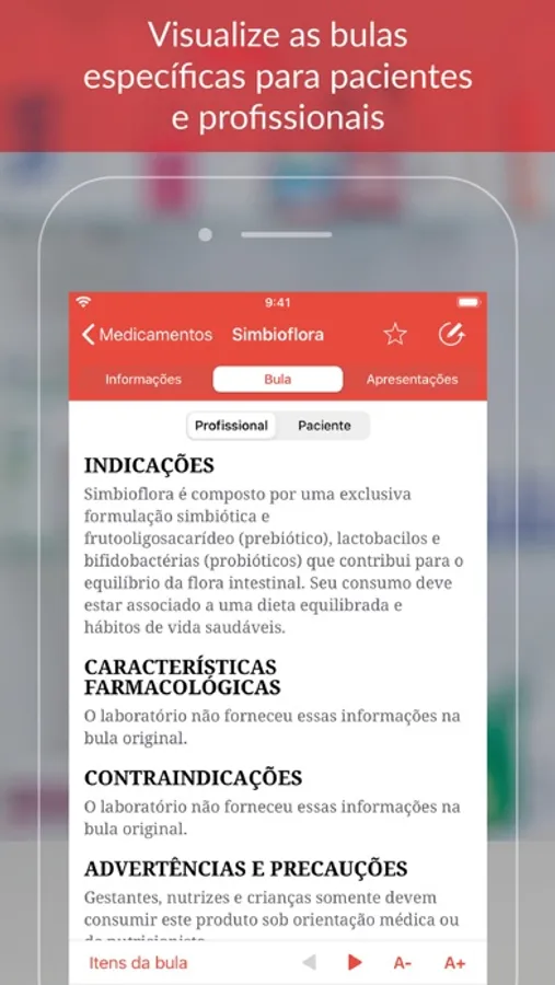 Inteligente, o aplicativo direciona o conteúdo de acordo com o perfil do usuário: profissionais de Saúde e estudantes cadastrados têm acesso exclusivo à bula do profissional, conseguem solicitar revisões, podem adicionar medicamentos em uma lista de favoritos, tudo de forma simples e prática.