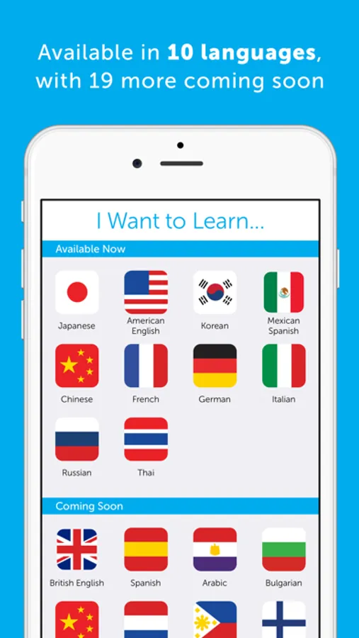 American English, British English, Chinese, French, German, Italian, Japanese, Korean, Mexican Spanish, Russian, Iberian Spanish, Thai