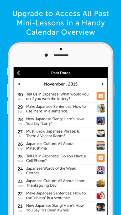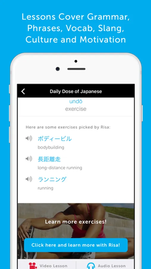 Your mini-lesson comes with native pronunciations, translations and in-depth explanations. If you want to learn even more, you can unlock access to relevant audio and video lessons for every mini-lesson. Simply upgrade with a quick in-app purchase to get complete access to the Daily Dose of Language App.