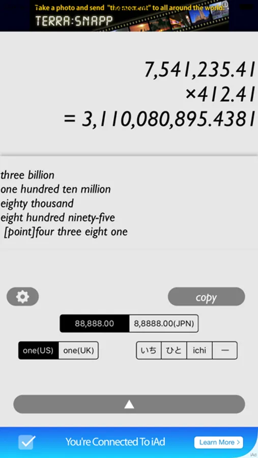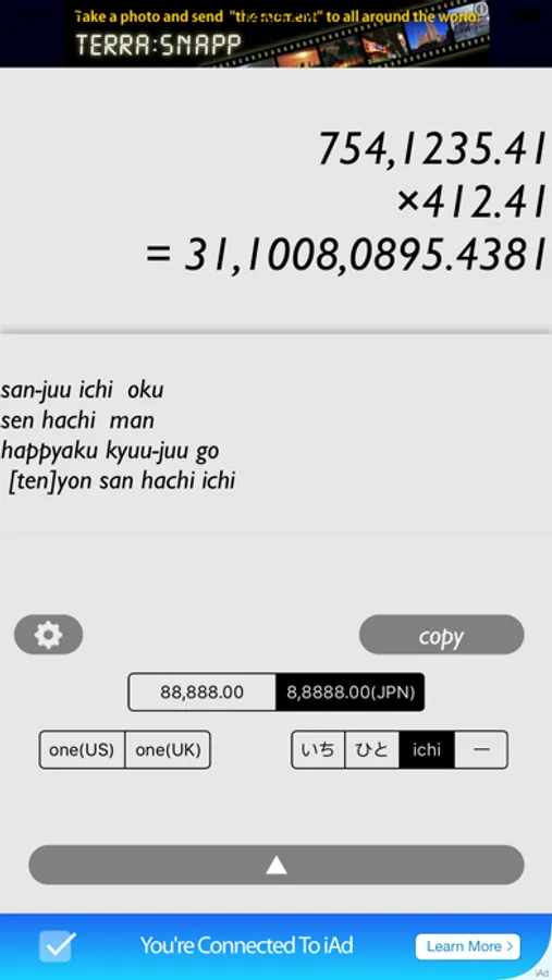 また、このアプリは、電卓で計算をしたら、その数字の部分をタップするだけで、いつでもその数字の読み方がわかるようになっています。