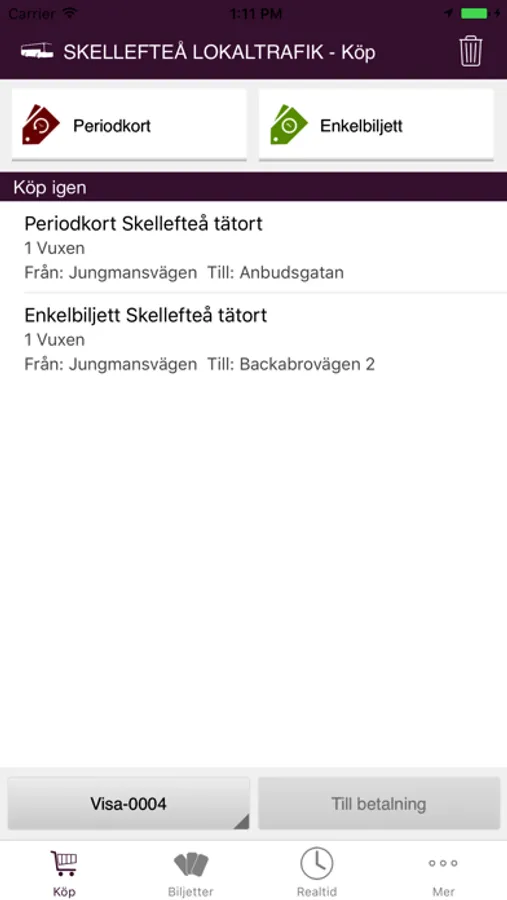 Betalning för ovan nämnda bussbiljetter görs genom registrering av betalkort i appen.