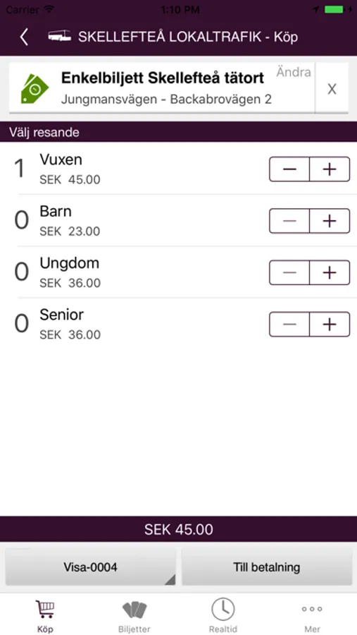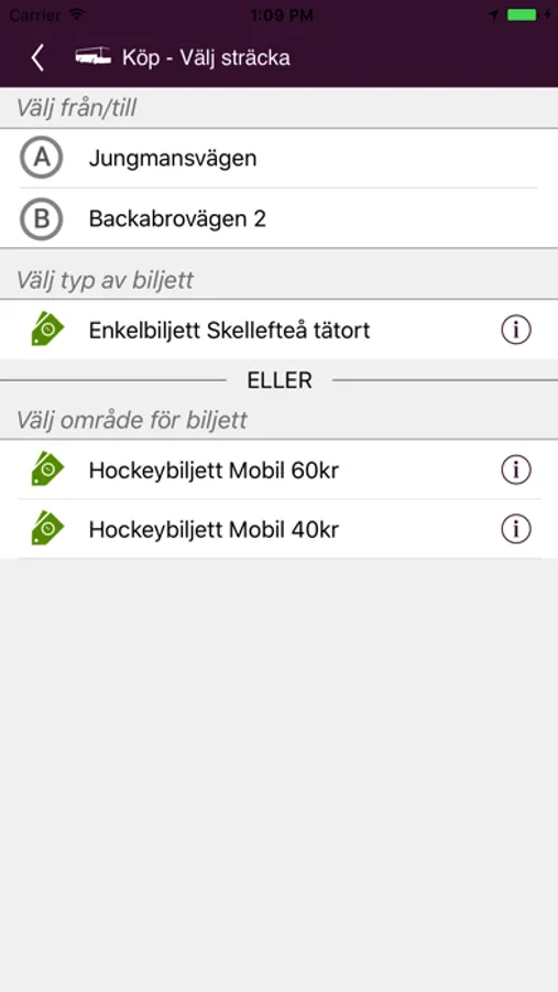 * Köp av följande bussbiljetter i Skellefteå Lokaltrafik: