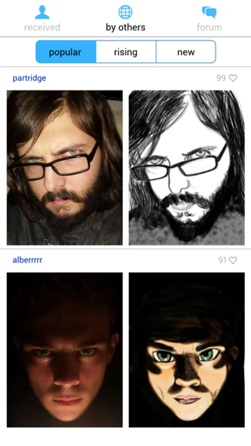 A social drawing app where people draw each other. Take a selfie, submit it and talented people from all around the world can draw a portrait of you!