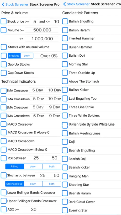 1. The Stock Screener Pro allows you to combine multiple technical indicators and scan the stock market. This will save you a lot of time as you no longer need to scan technical indicator one by one. For example, you can search for stocks trading in the range of $5-$10 with volume 100,000-1,000,000 that formed a bullish engulfing pattern and a macd crossover with one shot. It takes only a few seconds to get you the result sets you desired.