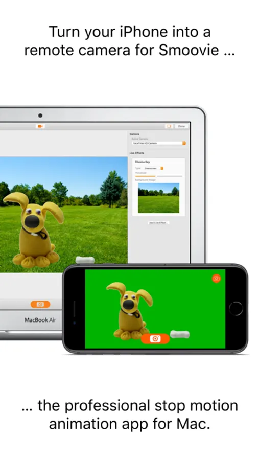 SmoovieCam wirelessly sends the camera feed from your iOS device to Smoovie on your Mac where you can use onion skinning and a suite of live effects to make amazing stop motion animations.