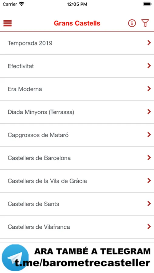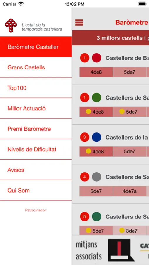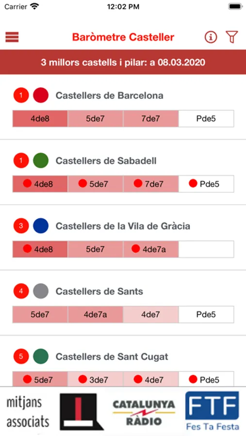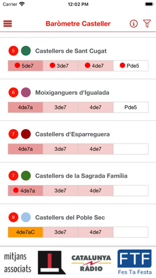 El color de fons de les cel.les dels castells correspon al grup al que pertanyen en la taula de punts del Concurs de Castells de Tarragona. A títol informatiu es destaca amb unes icones de colors les novetats de les darreres jornades. El logo del Baròmetre indica que rebran el trofeu Baròmetre Casteller.