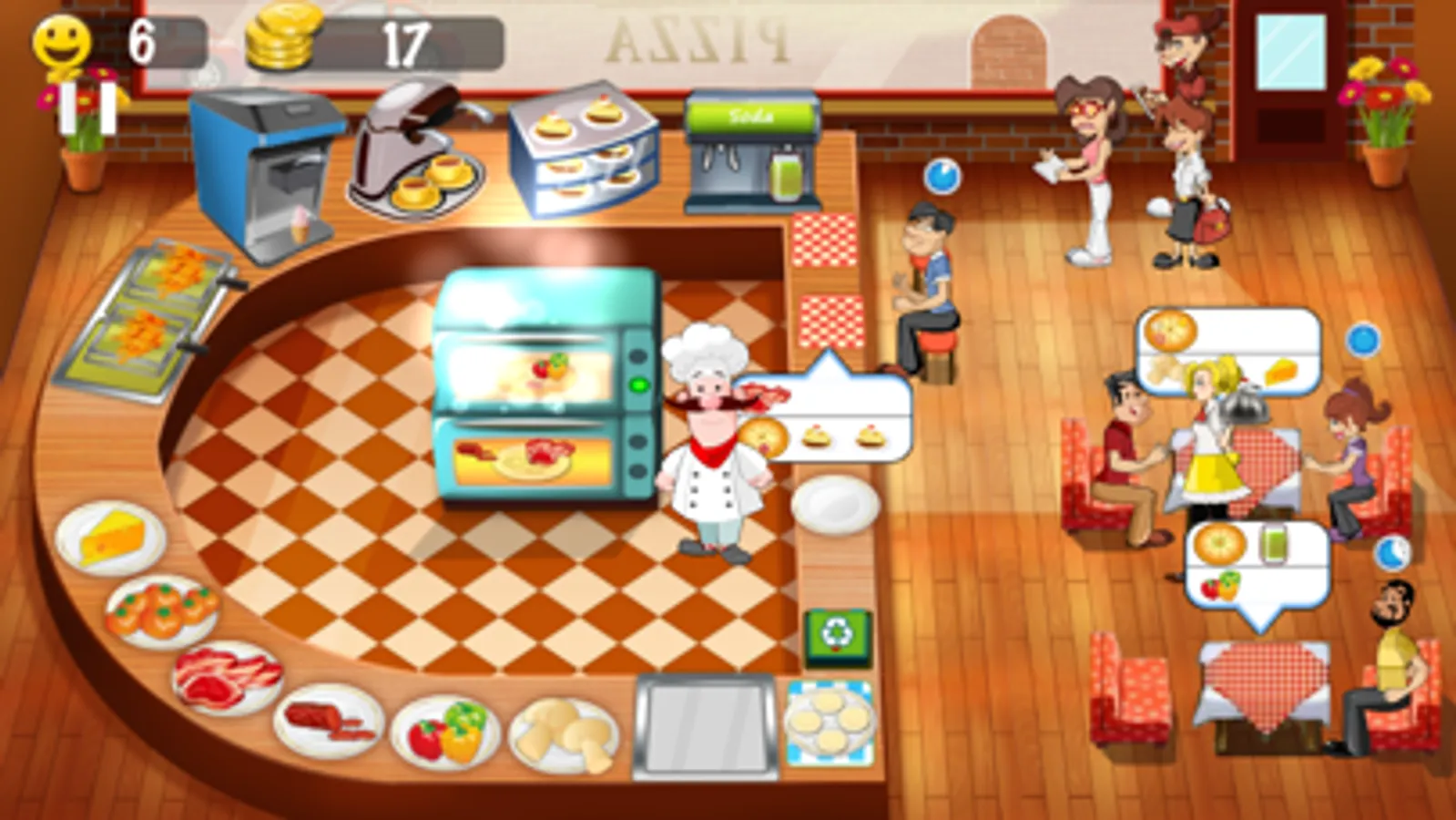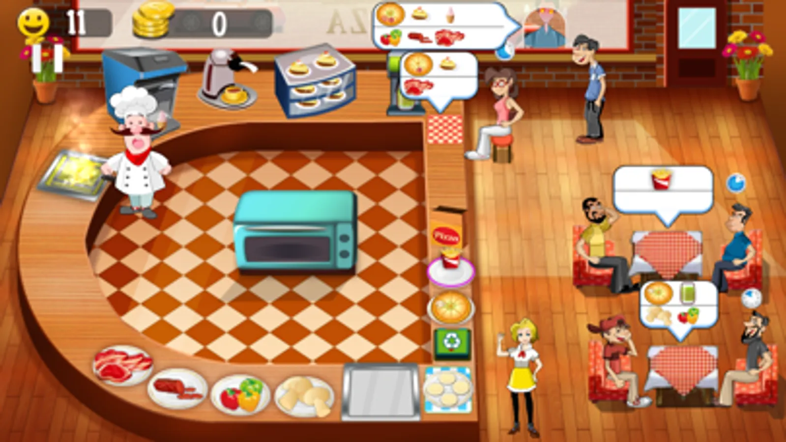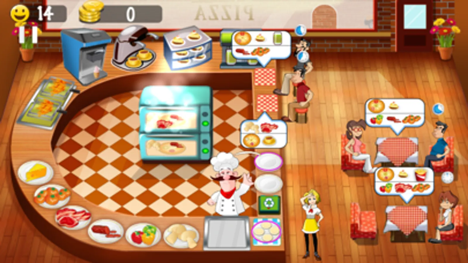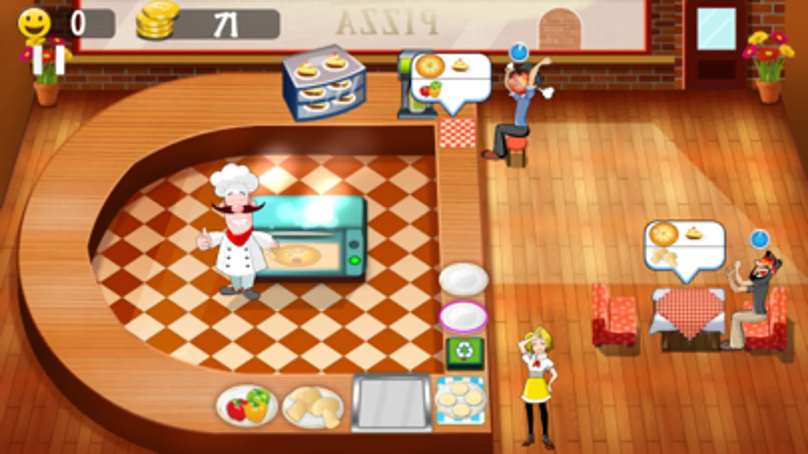 You will start up with a simple and crude pizza cafe with only one oven for preparing pizza, a 2-seat table and a bar seat for serving customers. You need to instruct the chef to prepare the dishes, instruct the waitress to deliver food to the customers in time, otherwise, they will be impatient and leave away. You may get extra tips if customers satisfy with your service.