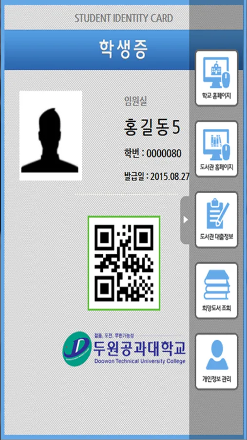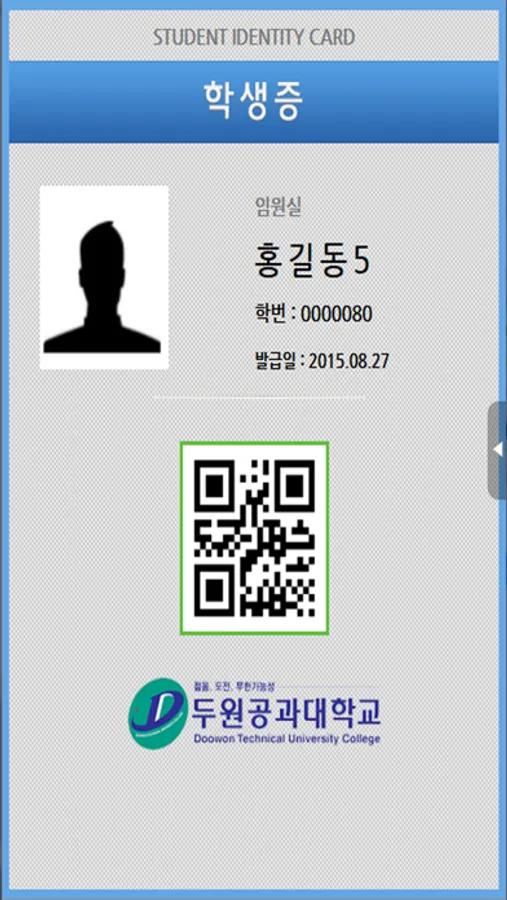 두원공과대학교 학생, 교직원이 도서관 이용을 위해 사용할 수 있는 모바일 학생증/신분증입니다.