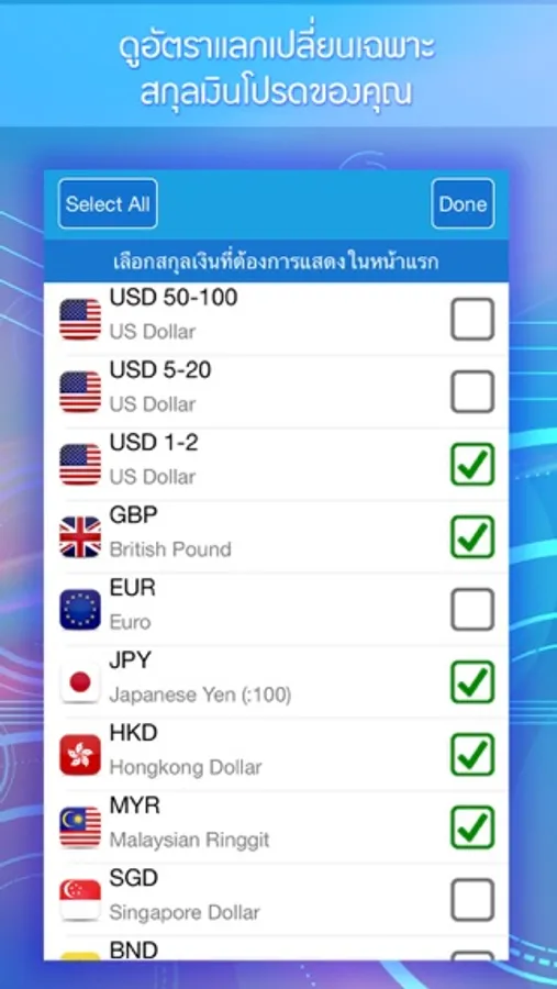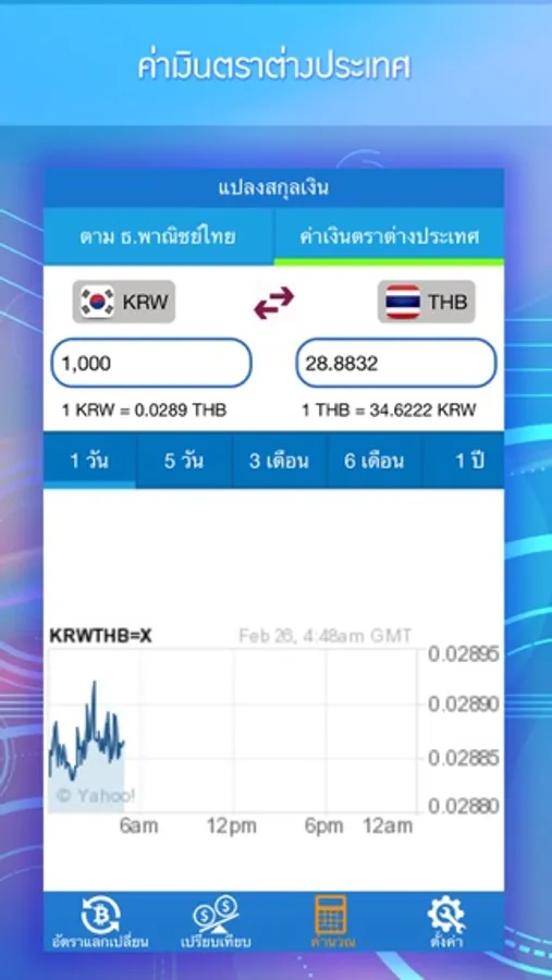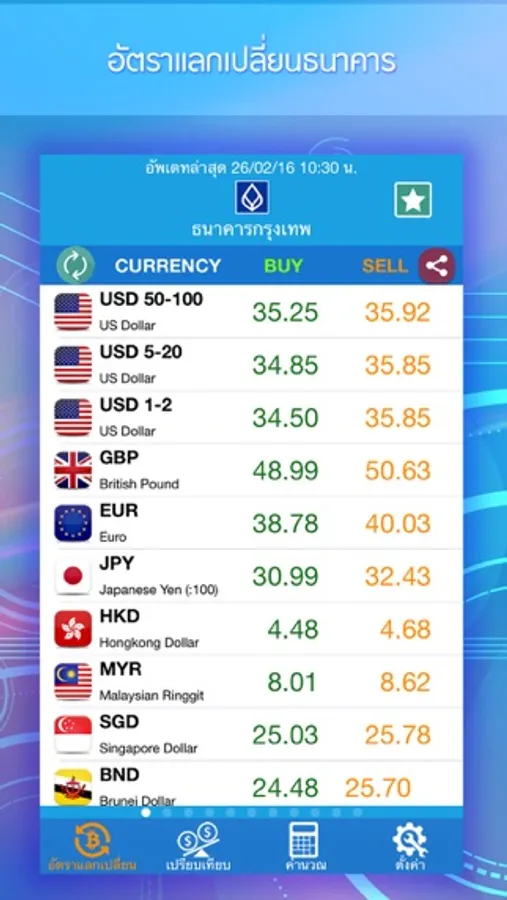 - Update every movements on world’s major currencies such as THB , USD , AED , AUD , BHD , BND , CAD , CHF , CNY , DKK , EUR , GBP , HKD, IDR , INR ,JOD , JPY , KRW , KWD , MYR , NOK , NZD , OMR , PHP , PKR , QAR , RUB , SAR , SEK , SGD , TWD , VND , ZAR , LAK , BRD , KHR , ILS , MOP , IQD , ESP