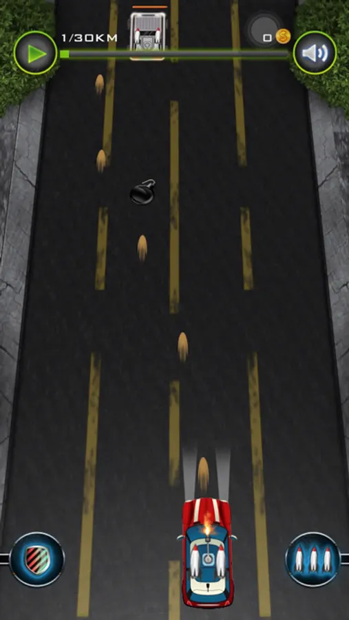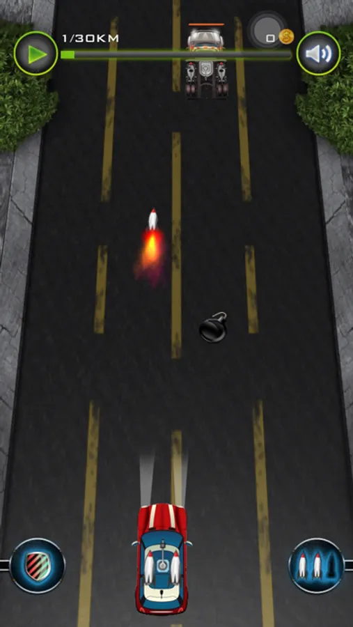 Tilting the screen to the left or right to drive, avoid bomb, missiles...and shoot opposite car,you can launch missiles to destroy other cars.