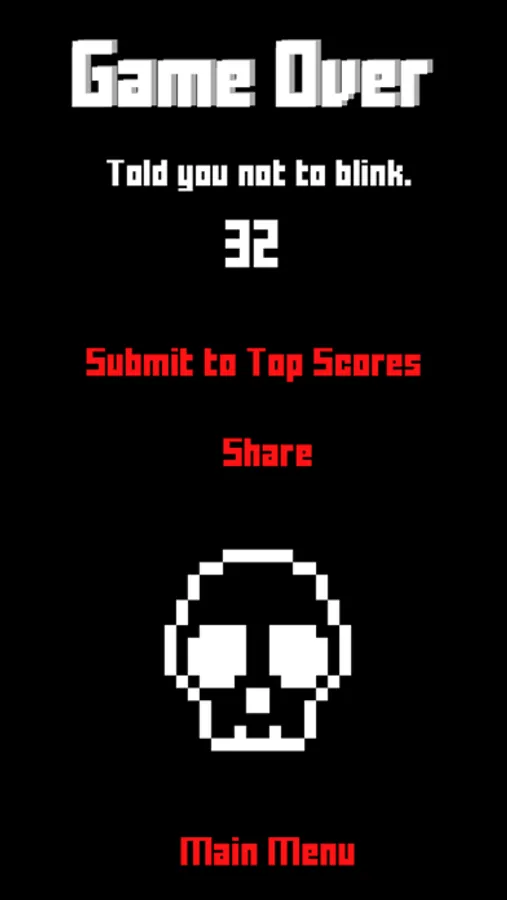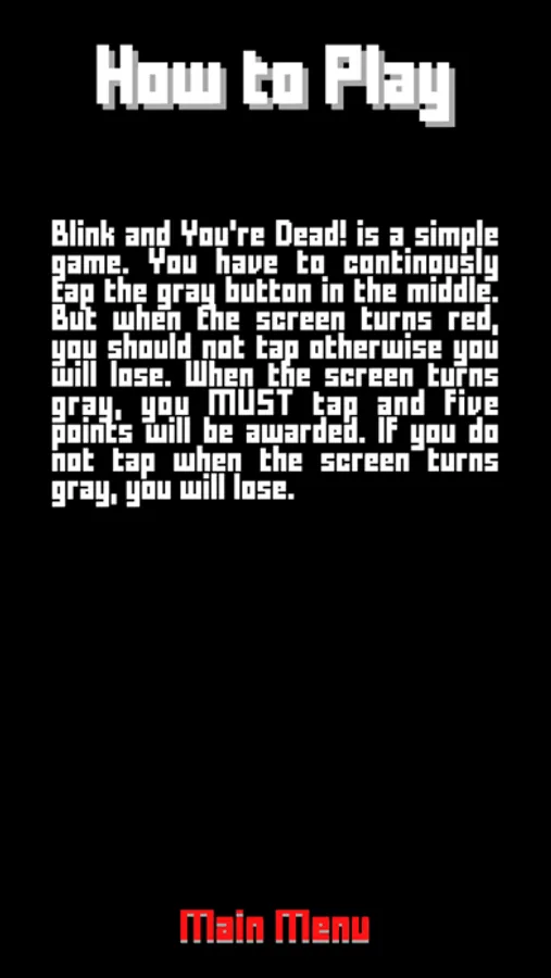 You better not blink! This game is very simple and fun. All you have to do is tap the center button continuously when the screen is black. If you tap when the screen is red, you will lose. If you tap when the screen turns gray, you will get extra points! But it will change only for milliseconds - one second it'll be a welcoming black, and the next it'll be red and you'll be dead!