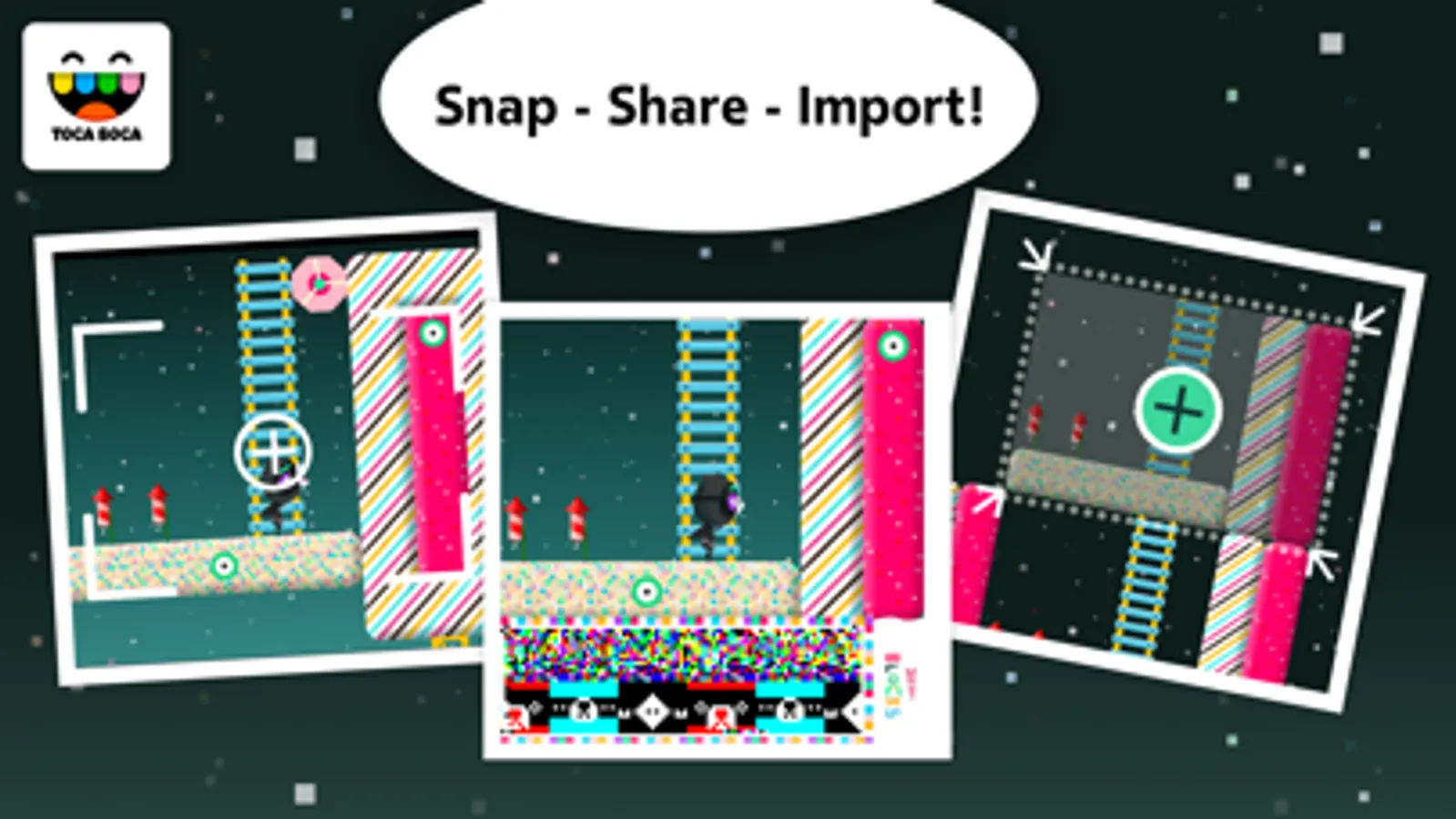 Save and share all the great work you’ve put into your worlds. Use the camera function to snap a photo. Share unique Blocks codes with family and friends so they can import your world and explore it themselves! Or import your friends’ worlds and make them part of your own!